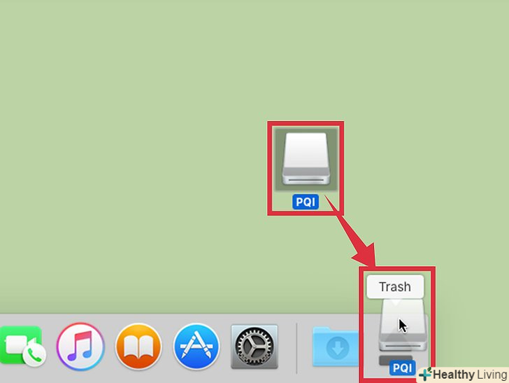 Вийміть диск.спочатку накопичувач потрібно витягти, і тільки потім відключити від комп'ютера — в іншому випадку можна пошкодити файли, що зберігаються на накопичувачі. Для цього перетягніть значок накопичувача, який знаходиться на робочому столі, в кошик (коли значок накопичувача буде знаходитися над значком кошика, відобразиться символ вилучення). Тепер вимкніть флеш-накопичувач від комп'ютера.- Також можна утримуватиCtrl і клацнути по значку накопичувача на робочому столі, а потім в меню вибрати «витягти».