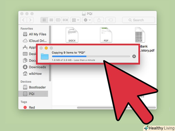 Скопіюйте файли на накопичувач.для цього перетягніть потрібні файли у вікно накопичувача-з'явиться індикатор виконання з оцінним часом завершення процесу.- Щоб виділити і скопіювати відразу кілька файлів, утримуйте кнопку миші і проведіть покажчиком над потрібними файлами, а потім перетягніть їх у вікно накопичувача. Також можна утримувати⌘ CMD і клацнути по кожному потрібному файлу, щоб вибрати їх по одному.