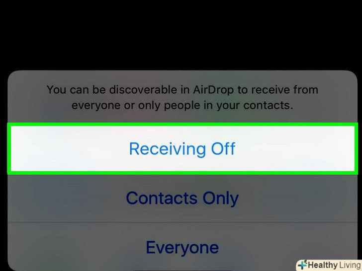 Торкніться < span class="nowrap" title="This is not a clickable button; it illustrates the button one should find." style="font-family: Segoe UI, Frutiger, Frutiger Linotype, Dejavu Sans, Helvetica Neue, Arial, sans-serif;letter-spacing:0px;padding:0em .6em; border:1px solid; border-color:#AAA #555 #555 #AAA; -moz-border-radius: 0px; -webkit-border-radius: 0px; border-radius: 0px; background-color: #F2F2F2; background-image: -moz-linear-gradient(top, #FCFCFC, #E0E0E0); background-image: -o-linear-gradient(top, #FCFCFC, #E0E0E0); background-image: - webkit-linear-gradient(top, # FCFCFC, #E0E0E0); background-image: linear-gradient(top, #FCFCFC, #E0E0E0);">вимкнути, щоб відключити. AirDrop. Поки ви не включите його знову, пристрій не буде приймати фото та інші дані по AirDrop.