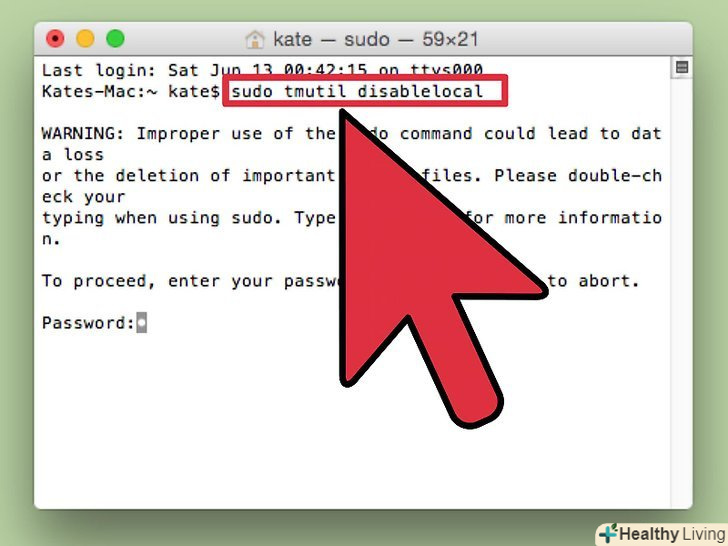 - Введіть "sudo tmutil disablelocal" і натисніть Enter