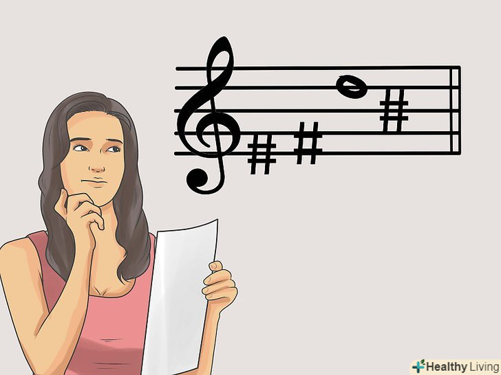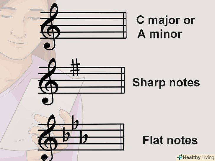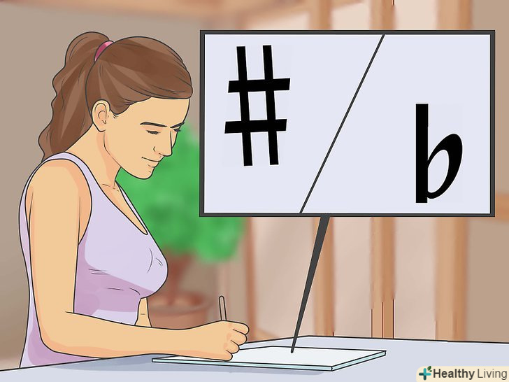 Визначте ключовий знак. з надрукованими нотами ви можете визначити ключ пісні, подивившись на її ключовий знак. Це набір невеликих позначок між ключем (скрипковий або басовий) і тимчасовою відміткою (числа, які виглядають як частки).[8]- Ви побачите або # (дієз) або ♭ (бемоль).
