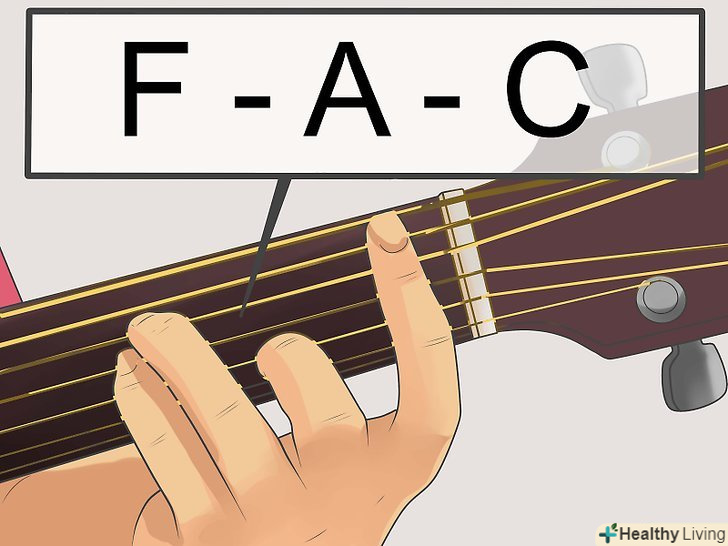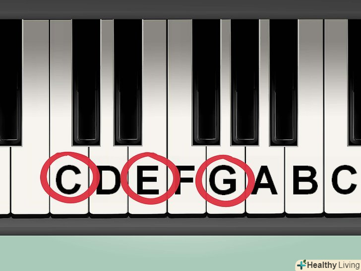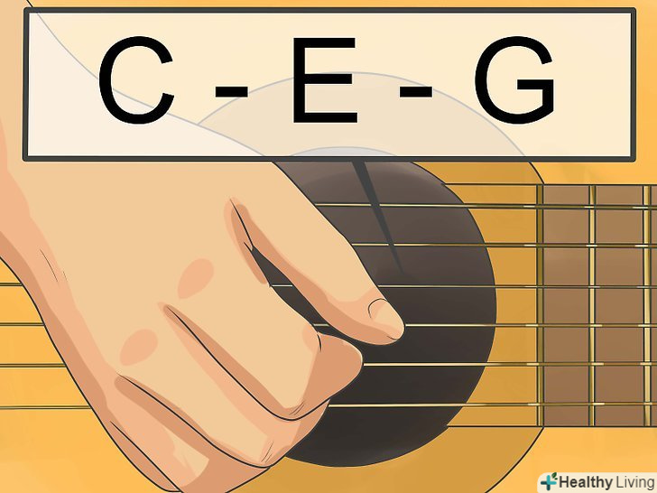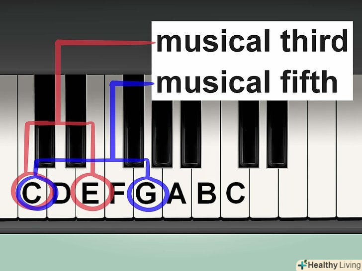 Поняття мажорних акордів. основний акорд складається з трьох нот, званих тризвуком, розташованих в терціях (більш детально в кроці 4). Ці акорди зазвичай засновані на такому звукоряді, як до мажор. Мажорні звукоряди містять два повних інтервалу між першою і другою нотами тризвуку. Мажорний акорд містить мажорну терцію і чисту квінту. Перша нота акорду зветься» коренем " акорду.[5]- Наприклад, щоб зіграти акорду на основі звукоряду до мажор, можете почати з C, тоніки, і використовувати її в якості «кореня» вашого акорду. Потім підніміться до терції цього звукоряду (на 4 півтони вище) до E, потім вгору до Квінти звукоряду (на півтора інтервалу вище до G). C-E-G і складатимуть мажорний акордний тризвук.