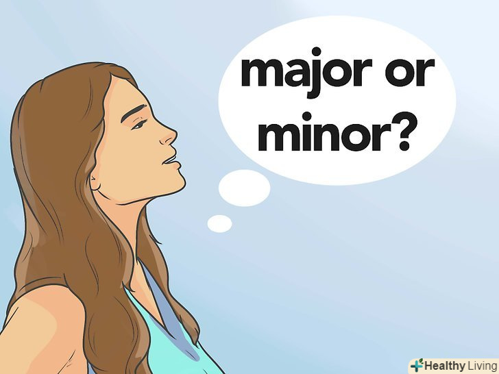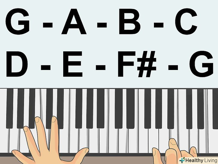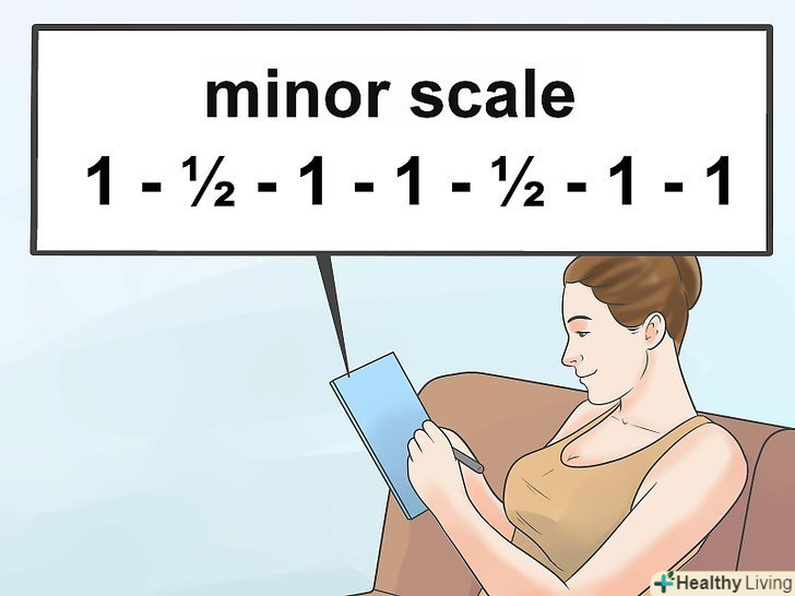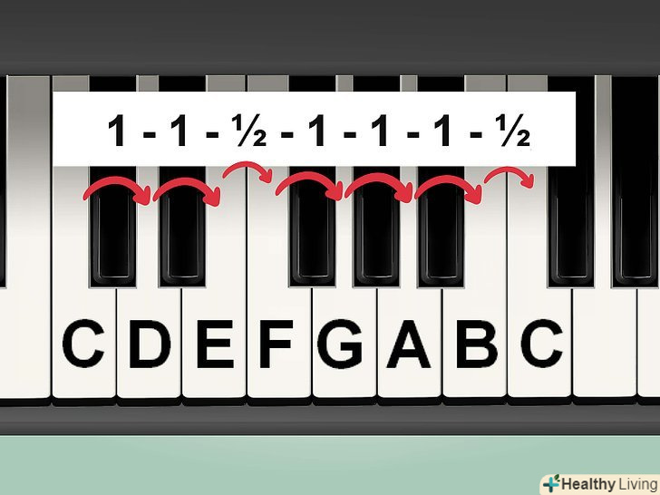 Поняття мажорних звукорядів. мажорний звукоряд має однаковий шаблон для повних інтервалів (1) і півтонів ( ½ ): 1 - 1 - ½ - 1 - 1 - 1 - ½. Таким чином, до мажорний звукоряд позначається C D E F G A B C.[2]- Ви можете створити будь-який інший мажорний звукоряд, змінивши початкову ноту (тоніку) і слідуючи схемі інтервалів.