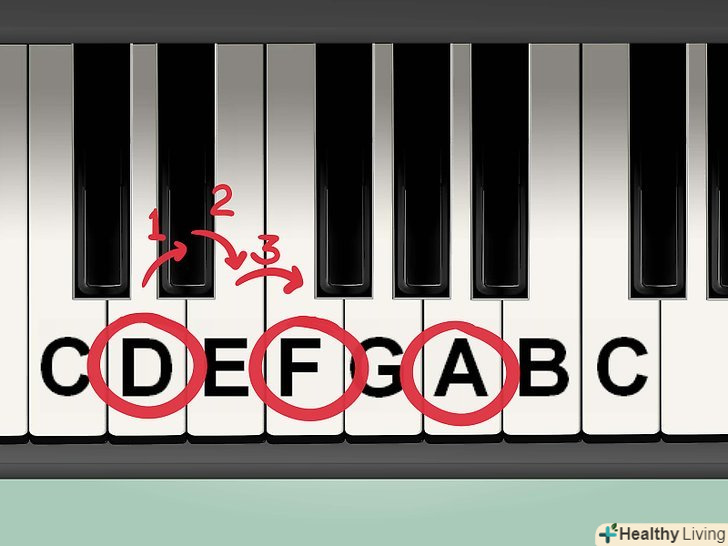 Поняття мінорних акордів.якість більшості акордів визначається терцією, або центральною нотою в тризвуки. Мінорні акорди містять півтора інтервалу між першою і другою нотами тризвуку, на відміну від чотирьох півтонів (або два повних інтервалу) мажорних акордів. Мінорний акорд містить мінорну терцію і чисту квінту.[6]- Наприклад, якщо ви поставите пальці на одну тональність вище основної ноти акорду до мажор, у вас вийде наступний акорд: D-F-A. цей акорд є мінорним акордом ре мажор, тому що інтервал між першою і другою нотами акорду (D і F) становитиме три півтони.