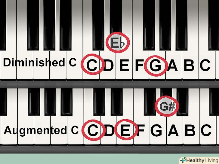 Поняття збільшених і зменшених акордів.ці акорди не настільки поширені, як мажорні або мінорні, але їх іноді використовують для створення особливих ефектів. Завдяки своїм змінам у звичних тризвуках, вони дозволяють створити меланхолійне, зловісне або моторошне звучання.[7]- Зменшений акорд містить мінорний тризвук і зменшену квінту (квінту, опущену на півтон). Наприклад, ось як буде виглядати зменшений акорд C: C - E♭ - G♭.