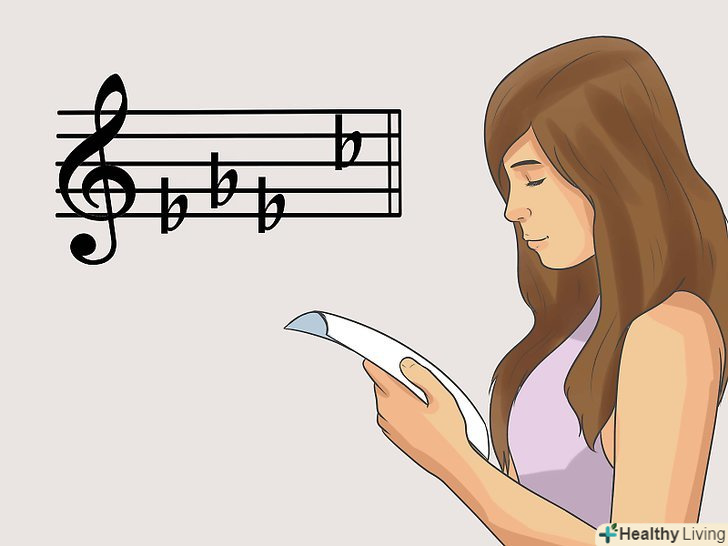 Читання нот з бемолями. для ключових знаків, що використовують бемолі, ключовий знак знаходиться в передостанній позначці бемолі (другий праворуч), якщо читати ноти зліва-направо.- Коли пісня має позначки бемолей на B ♭, E ♭ і A♭ - E ♭ є передостанньою відміткою бемолі, а значить, твір виконано в тональності мі-бемоль.