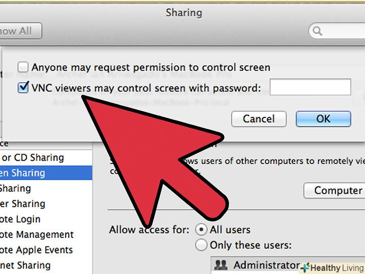 - У цьому ж вікні увімкніть опціюVNC viewers may control screen with password і виберіть пароль.