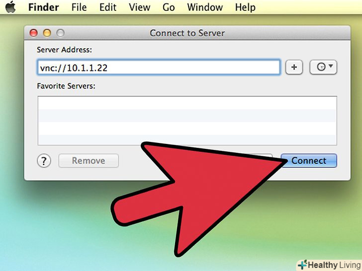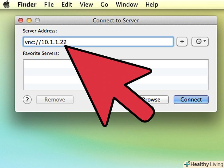 У вікні напишітьVnc://, потім IP-адресу комп'ютера, до якого хочете приєднатися. (Наприклад: vnc://10.1.1.22)