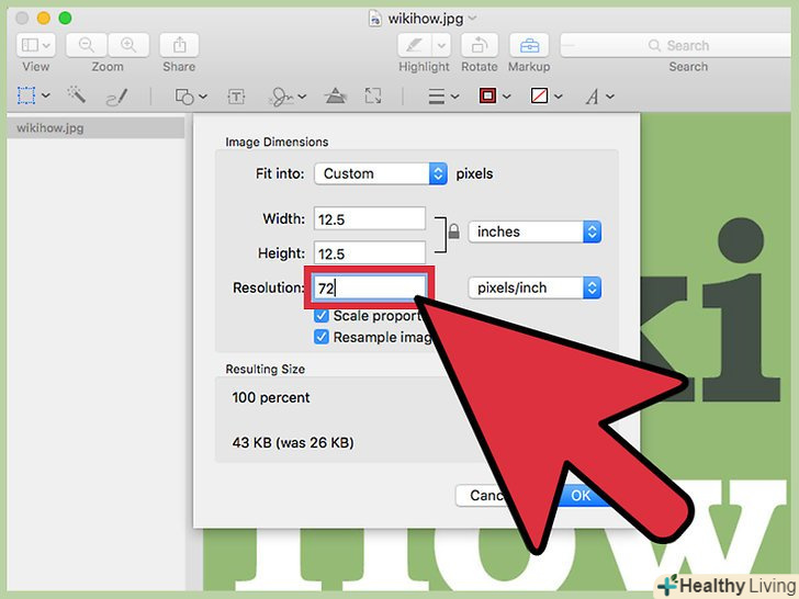 Змініть роздільну здатність зображення. [2] дозвіл вимірюється в пікселях на дюйм. Якщо ви хочете роздрукувати зображення або просто хочете, щоб якість зображення не погіршилася, тоді вам варто збільшити дозвіл.- Якщо ви хочете використовувати зображення в інтернеті або в додатку, на зразок Facebook, дозволу за замовчуванням (72 пікселя) буде достатньо. Якщо спочатку зображення має більшу роздільну здатність, його зменшення призведе до зменшення розміру файлу.