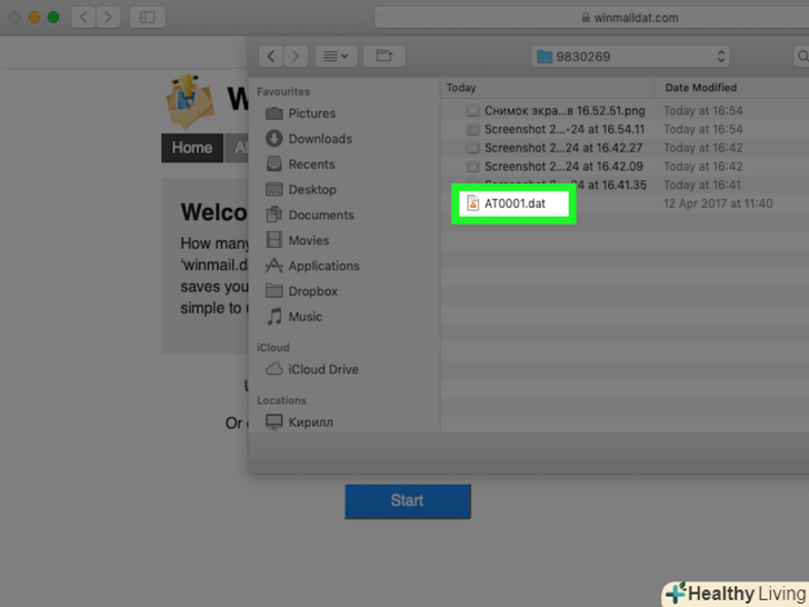 Виберіть потрібний файл winmail.dat або ATT0001.dat.у вікні Finder відкрийте папку зі збереженим файлом winmail.dat або ATT0001.dat. Клацніть по файлу, щоб вибрати його.