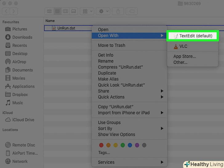 У списку виберіть< span class="nowrap" title="This is not a clickable button; it illustrates the button one should find." style="font-family:Lucida Sans Unicode,Lucida Grande,sans-serif;font-size:14px;padding:0em 1em; border:1px solid; border-color:#AAA #555 #555 #AAA; -moz-border-radius: 4px; -webkit-border-radius: 4px; border-radius: 4px; background-color: #F2F2F2; background-image: -moz-linear-gradient(top, #FCFCFC, #E0E0E0); background-image: -o-linear-gradient(top, #FCFCFC, #E0E0E0); background-image: -webkit-linear-gradient(top, #FCFCFC, #E0E0E0); background-image: linear-gradient(top, #FCFCFC, #E0E0E0);">TextEdit.у цій програмі можна відкрити більшість текстових файлів, переглянути текст і з'ясувати, з якою програмою працює цей dat-файл. Якщо dat-файл не відкривається в TextEdit, швидше за все, це не текстовий файл. Пам'ятайте, що деякі dat-файли заблоковані і відкрити їх не можна.