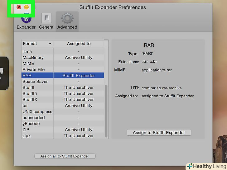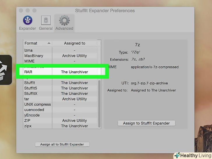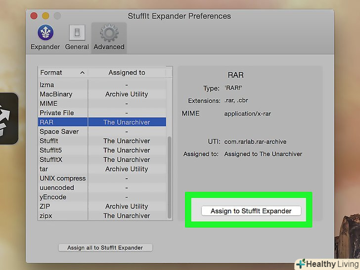 НатиснітьAssign to StuffIt Expander (асоціювати зі StuffIt Expander). ця опція знаходиться в правій частині вікна. Тепер StuffIt Expander зможе відкривати RAR-файли.