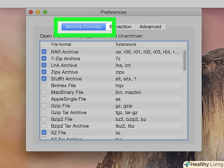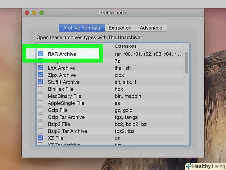 Встановіть прапорець біля "RAR".тепер Unarchiver зможе відкривати RAR-файли.