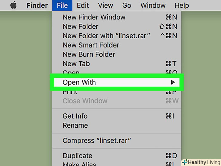 Клацніть поФайл. це меню знаходиться у верхній частині екрана.- У деяких випадках просто двічі клацніть по RAR-файлу, і він відкриється в програмі Unarchiver. Можливо, це не спрацює, якщо на комп'ютері встановлено кілька програм-архіваторів, які вміють працювати з rar-файлами.