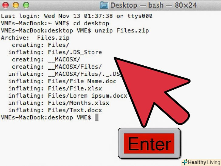 Наберіть "unzip" file name "" і натисніть enter ще раз. замість" file name " введіть повне ім'я файлу, включаючи .zip- Наприклад, якщо файл називається "file.zip", введіть CD desktop, натисніть enter, наберіть "unzip file.zip " і натисніть enter знову.