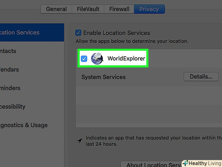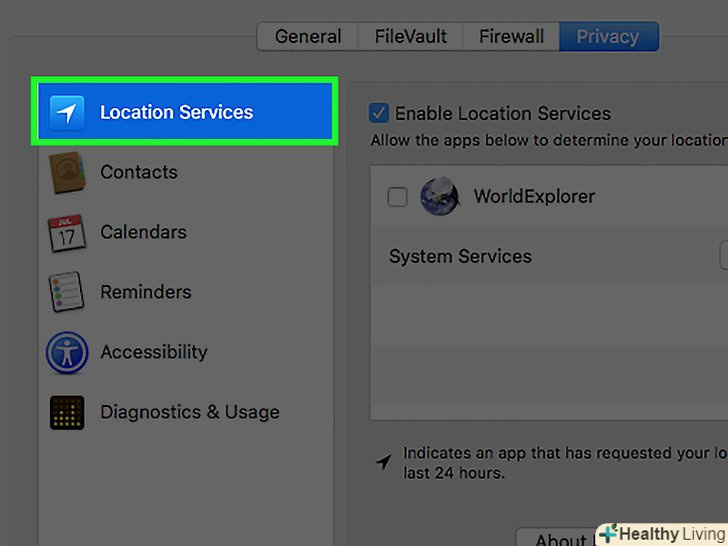 Клацніть по сервісу на лівій панелі. На цій панелі відображаються служби, з якими можуть працювати програми, перераховані на правій панелі.- Наприклад, служба "геолокація", яка знаходиться зліва, може працювати з додатком "карти«, яке відображається праворуч, тому що» карти" використовують геолокацію для визначення місця розташування.