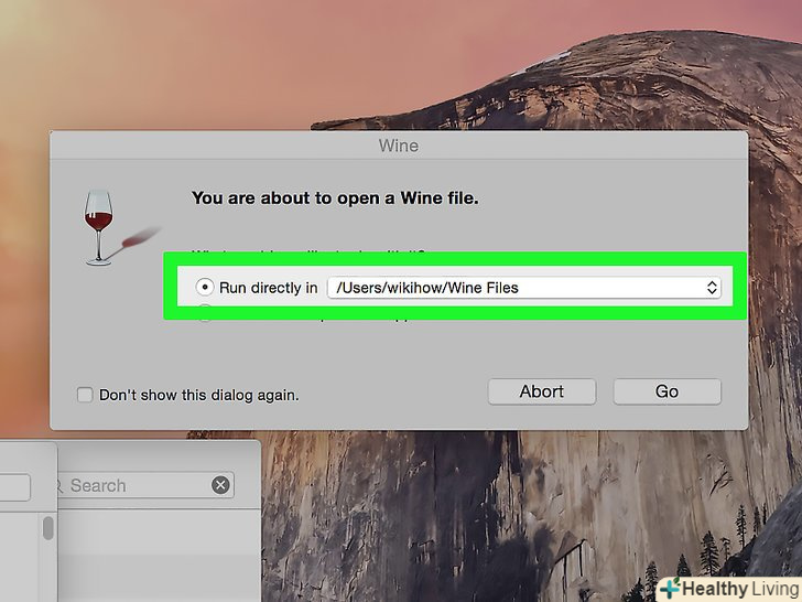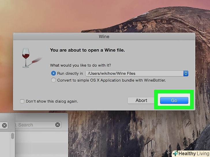 НатиснітьGo (запустити). це блакитна кнопка, яка знаходиться в нижньому правому куті вікна з попередженням. Якщо exe-файл підтримується WINE, він буде запущений.- Якщо EXE-файл не запускається за допомогою WINE, скористайтеся наступним методом.