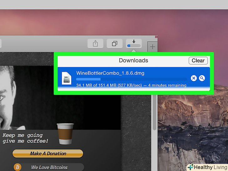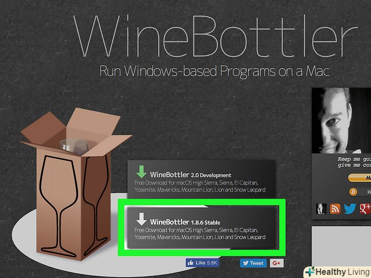Натисніть "WineBottler 1.8-RC4 Development".ця кнопка відобразиться посередині екрану; на ній ви знайдете значок у вигляді зеленої стрілки.- Якщо ви працюєте з системою, випущеною до версії OS X Capitan, натисніть кнопку " WineBottler 1.6.1 Stable».