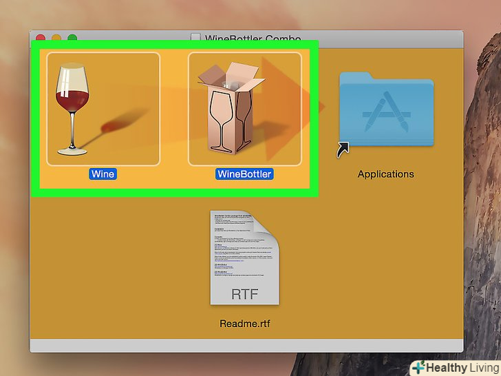 Встановіть WineBottler.для цього двічі клацніть по установчому файлу WineBottler, а потім перетягніть значки» Wine «і» WineBottler «в синю папку»Програми".