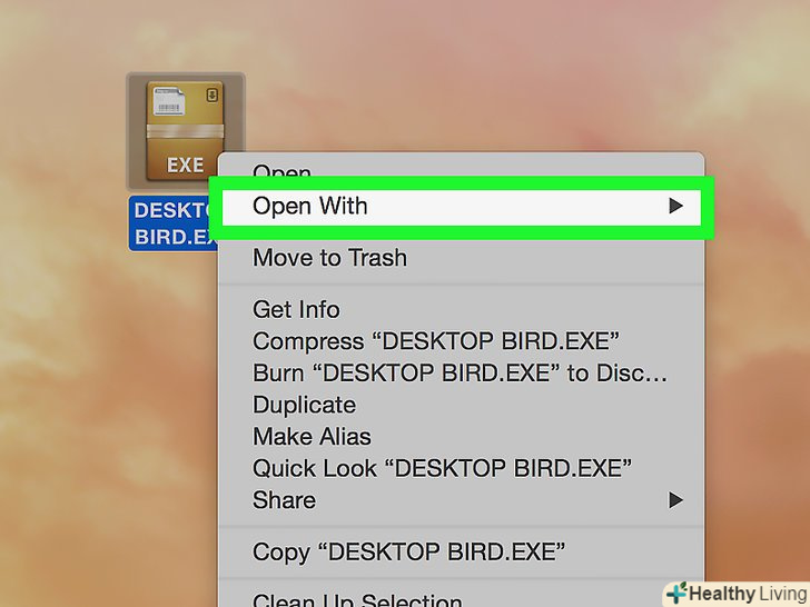У меню виберіть< span class="nowrap" title="This is not a clickable button; it illustrates the button one should find." style="font-family:Lucida Sans Unicode,Lucida Grande,sans-serif;font-size:14px;padding:0em 1em; border:1px solid; border-color:#AAA #555 #555 #AAA; -moz-border-radius: 4px; -webkit-border-radius: 4px; border-radius: 4px; background-color: #F2F2F2; background-image: -moz-linear-gradient(top, #FCFCFC, #E0E0E0); background-image: -o-linear-gradient(top, #FCFCFC, #E0E0E0); background-image: -webkit-linear-gradient(top, #FCFCFC, #E0E0E0); background-image: linear-gradient(top, #FCFCFC, #E0E0E0);">Open with (Відкрити за допомогою).ця опція знаходиться у верхній частині меню.