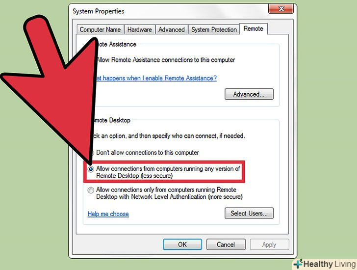 Виберіть Дозволити підключення віддаленого помічника до цього комп'ютера. натисніть OK або застосувати. Зробіть це на комп'ютері, до якого хочете підключитися. Запам'ятайте, що можна підключитися тільки комп'ютери з Windows 7 Professional, Windows 7 Ultimate, Windows Vista Busines або Windows Vista Ultimate з будь-якої версії Windows 7.