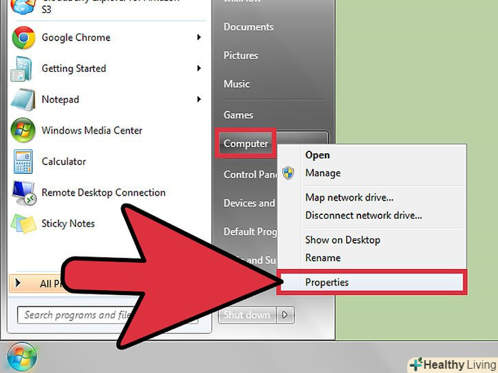 Відкрийте меню Пуск Windows, наведіть на Комп'ютер і зробіть правий клацання, щоб відкрити меню, що випадає. натисніть на властивості.