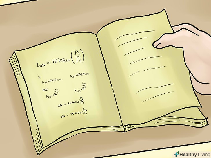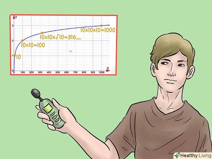 Розуміння логарифмічної природи децибел.як було сказано вище, децибели-це логарифмічні значення з основою 10. Для будь-якого даного значення децибел, шум на 10 децибел великий – голосніше початкового в два рази, а шум більший на 20 децибел – в чотири рази і так далі. Це дає можливість позначити великий проміжок інтенсивностей звуку, які можуть бути сприйняті людським вухом. Найгучніший звук, який людина може почути, не відчуваючи болю-в мільярд разів голосніший, ніж самий тихий звук, який людина може почути.[8] використовуючи децибели, ми уникаємо використання величезних чисел для опису звичайних звуків-замість цього нам достатньо трьох цифр.- Подумайте, що простіше використовувати: 55 децибел або 3 × 10-7 ватт/квадратний метр? Обидва значення рівні, але замість використання наукової форми запису (у вигляді дуже малої частки числа), набагато зручніше використовувати децибели, які є свого роду простим скороченням для легкого повсякденного використання.