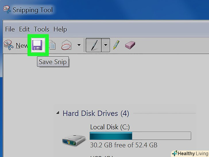 НатиснітьЗберегти. це значок, який виглядає як фіолетова дискета. Відкриється вікно "Зберегти як"; введіть в ньому ім'я файлу знімка екрану і вкажіть папку для збереження.- Картинки утиліти "Ножиці" зберігаються у форматі JPEG. Щоб поміняти його, відкрийте меню "Тип файлу" і виберіть інший формат.