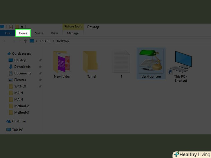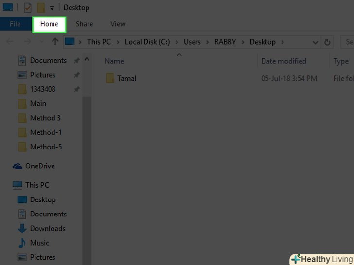 Клацніть по вкладціГоловна. вона знаходиться у верхньому лівому кутку вікна Провідника. Вгорі вікна відкриється панель інструментів.
