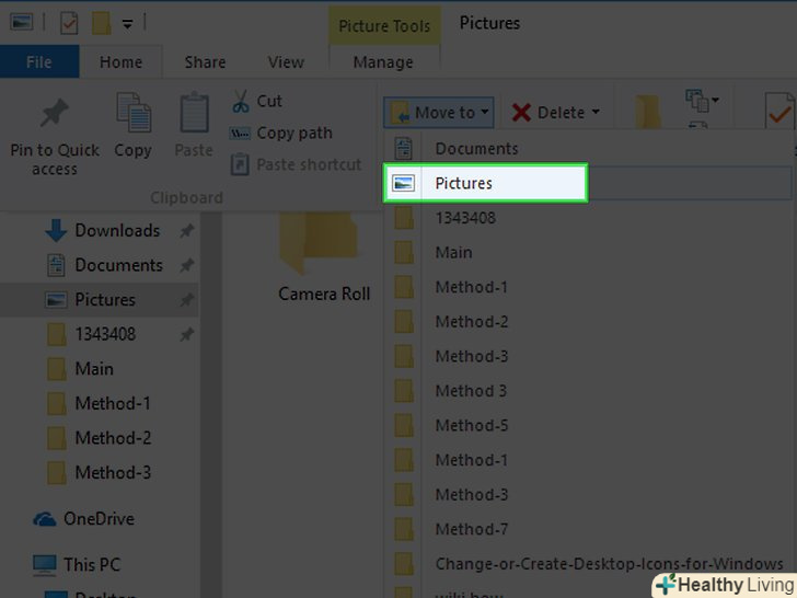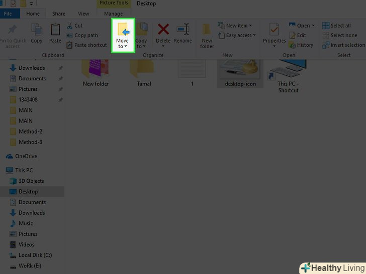 Клацніть поПеремістити в.ця опція знаходиться в розділі "упорядкувати" у верхній частині вікна Провідника.
