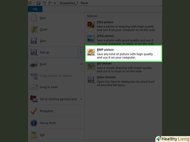 Клацніть поЗображення у форматі BMP. це опція праворуч від "Зберегти як". Відкриється вікно "Зберегти як", в якому можна вказати ім'я файлу.