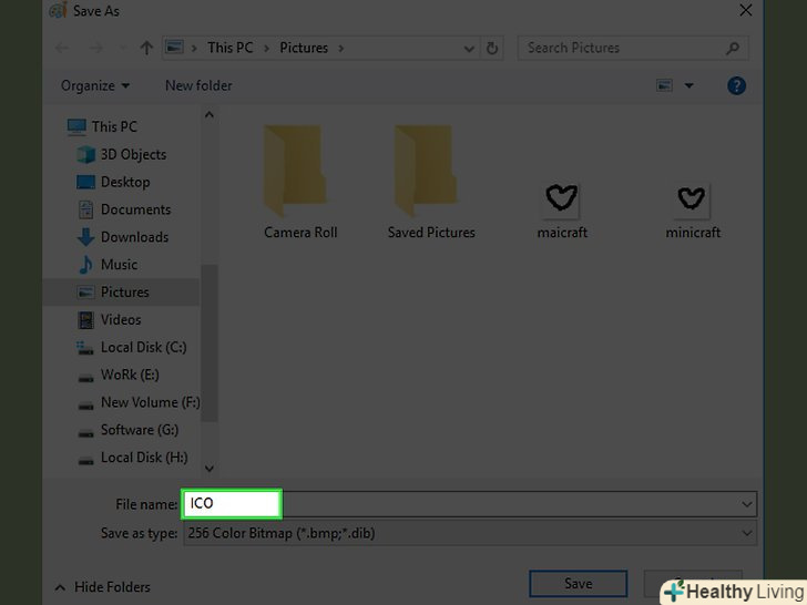Введіть ім'я файлу, а потім введіть розширення.ico. так файл буде збережений як файл значка.- Наприклад, файл можна назвати так " ярлик.ico».