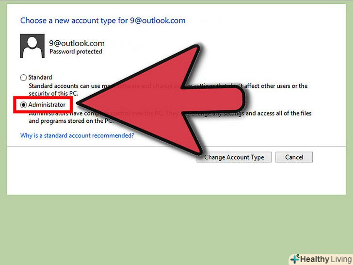 Виберіть "Адміністратор". натисніть кнопку Змінити тип облікового запису, щоб зберегти зміни. Тепер, обліковий запис має права адміністратора.