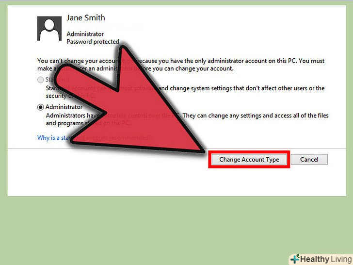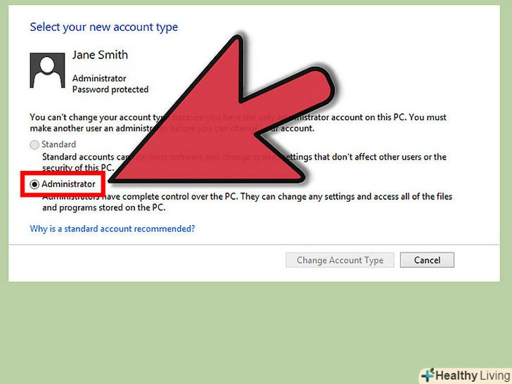 Натисніть на "Змінити тип облікового запису", щоб зробити її адміністраторською.