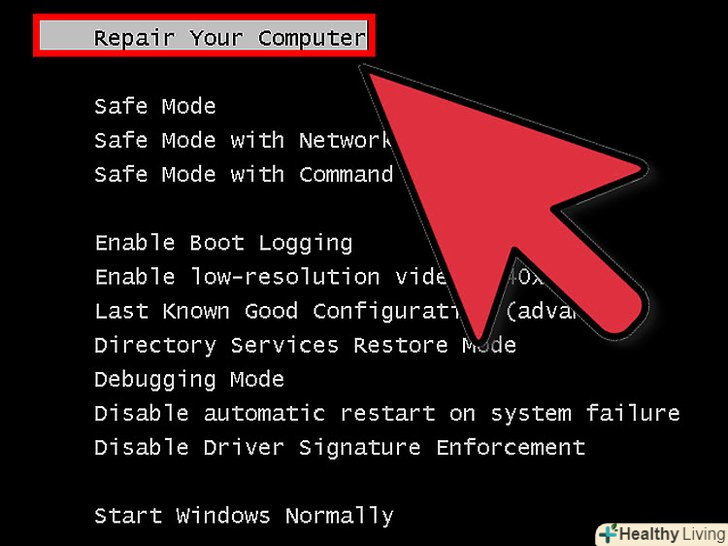 Коли комп'ютер вмикається, утримуйте клавішу F8 перед тим, як з'явиться екран Windows.З'явиться меню з декількома опціями. Хороший вибір це "Safe Mode with Command Prompt»або "Безпечний режим з командним рядком". Виберіть, що хочете.