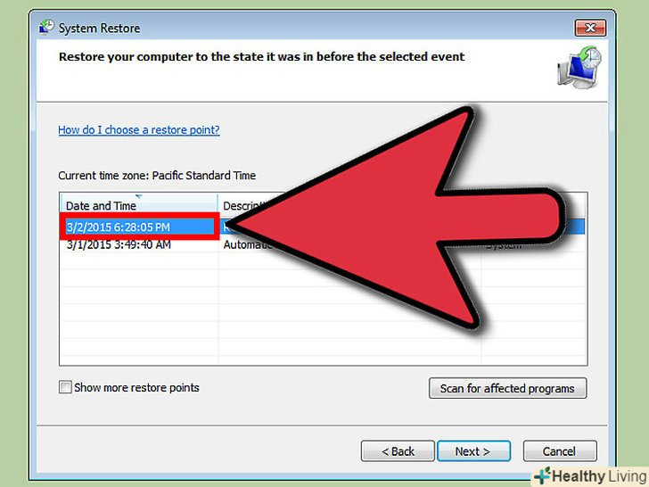 Виберіть точку відновлення.вам буде запропоновано список доступних точок відновлення. Порівняйте дати, щоб знайти ту, коли була створена перед оновленням DirectX. Натисніть кнопку "Scan for affected programs", щоб гарантувати, що буде виконаний відкат DirectX.- Пам'ятайте, все, що було встановлено або оновлено між точкою і теперішнім станом, буде видалено. Будь-які програми, які тоді були встановлені, але тепер запущені, будуть перевстановлені.
