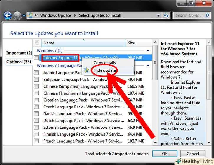 - Приховати оновлення.якщо ви не хочете отримувати пропозицію оновити Internet Explorer до 11-ї версії в майбутньому, Ви можете приховати його зі списку оновлень Windows, і надалі центр оновлення буде його ігнорувати.