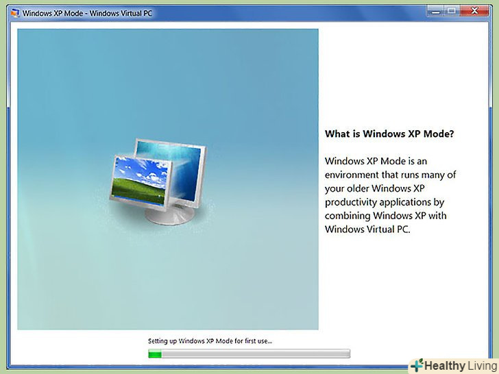 Відкрийте «Virtual PC» вперше.виберіть папку "Windows Virtual PC «в меню» Пуск«, і далі виберіть» Windows XP Mode" з папки, яка відкриється. Вас попросять погодитися з ліцензійною угодою, і після «Windows XP» почне встановлюватися на ваш «Virtual PC». Як тільки установка закінчитися, на робочому столі з'явитися віконце, показуючи робочий стіл Windows XP.- Вам варто встановити антивірус на віртуальну "Windows XP", навіть якщо у вас вже є встановлений антивірус на комп'ютері.