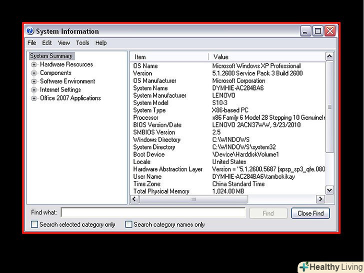 Натисніть Enter.залежно від того, як швидко ваш комп'ютер працює, ви повинні незабаром побачити збільшене спливаюче вікно під назвою System Information.Якщо нічого не відбувається, або Ви отримуєте повідомлення про помилку, ви, ймовірно, ввели її неправильно. Спробуйте ще раз або скопіюйте та вставте команду з цієї веб-сторінки.- На головній сторінці буде вказана інформація System Summary основ вашої системи, як правило, починаючи з операційної системи. Це місце, де ви отримаєте більшу частину основної інформації, яку Ви шукаєте.