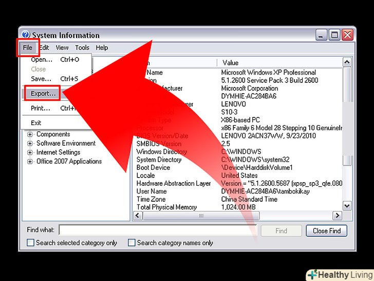 По-перше, переконайтеся, що ви вибрали перший запис у лівій панелі: System Summary. Якщо ви цього не зробите, то ви не збережете всю інформацію про комп'ютер, тільки частина, в яку вам вийшло зайти.