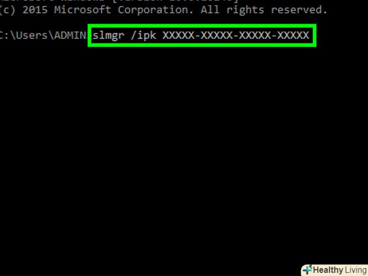 Введіть у командний рядок "slmgr / ipk XXXXX-XXXXX-XXXXX-XXXXX", замінивши символи x новим ключем продукту.таким чином, ви встановите новий ключ продукту на комп'ютер, на підтвердження чого на екрані з'явиться спливаюче повідомлення з інформацією, що ключ був успішно оновлений.
