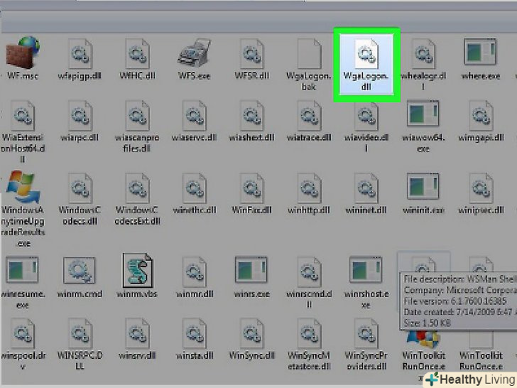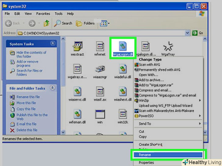 Перейменуйте файл " WgaLogon.dll». клацніть по ньому правою кнопкою миші, натисніть "перейменувати", введіть .bak після імені файлу та розширення, а потім натисніть ↵ Enter.- Тепер файл повинен називатися так: "WgaLogon.dll.bak».
