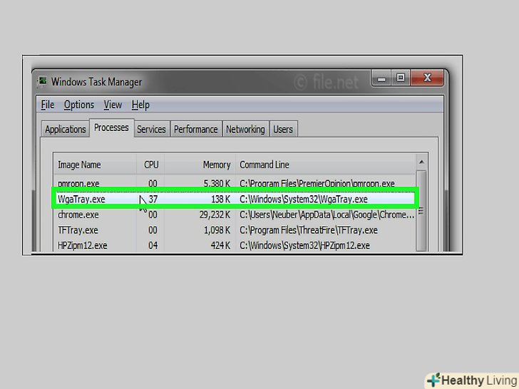 - Диспетчер завдань-перейдіть на вкладку "Процеси«, прокрутіть її вниз, знайдіть" WgaTray.exe " і натисніть на нього.