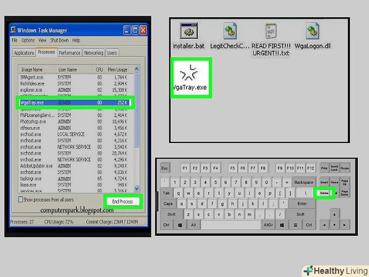 Видаліть файл і процес " WgaTray.exe».виберіть файл " WgaTray.exe» в папці «System32» і натисніть клавішу Del; тепер швидко перейдіть у вікно Диспетчера завдань і натисніть «Завершити процес» в правому нижньому кутку вікна.