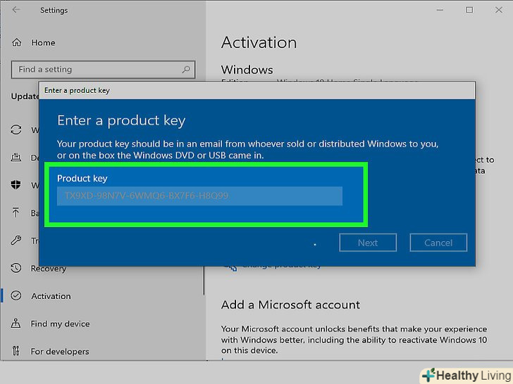 Введіть ключ продукту Windows 10.введіть ключ, який постачається з копією Windows 10, у текстове поле.- Зазвичай ключ є на компакт-диску, якщо ви купили диск з системою, або в електронному листі з підтвердженням від Microsoft, якщо ви купили ключ продукту в Інтернеті.