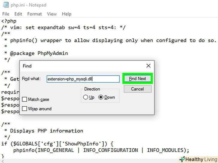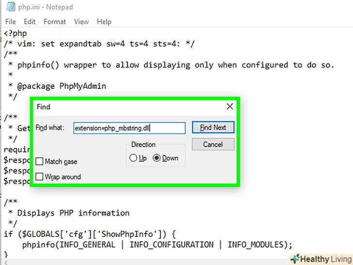 Знайдіть рядок з текстом " extension=php_mbstring.dll " і видаліть крапку з комою. крапку з комою ви знайдете зліва від цього рядка.- НатиснітьCtrl+F, щоб відкрити вікно «Знайти», а потім введіть вказаний текст щоб швидко перейти до нього.