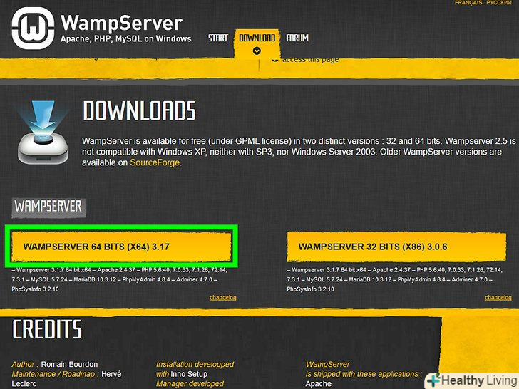 Прокрутіть вниз і натиснітьWAMPSERVER 64 BITS або WAMPSERVER 32 BITS.версія залежить від розрядності вашої операційної системи. Відкриється спливаюче вікно.