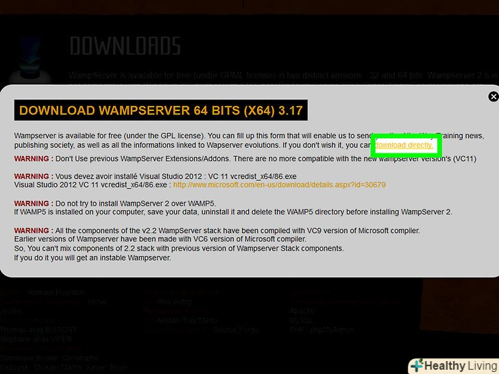 Клацніть по посиланнюDownload directly (завантажити безпосередньо). вона знаходиться у верхній правій частині спливаючого вікна. Відкриється сторінка Source Forge, на якій можна завантажити обрану версію WAMP.