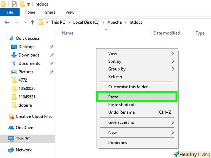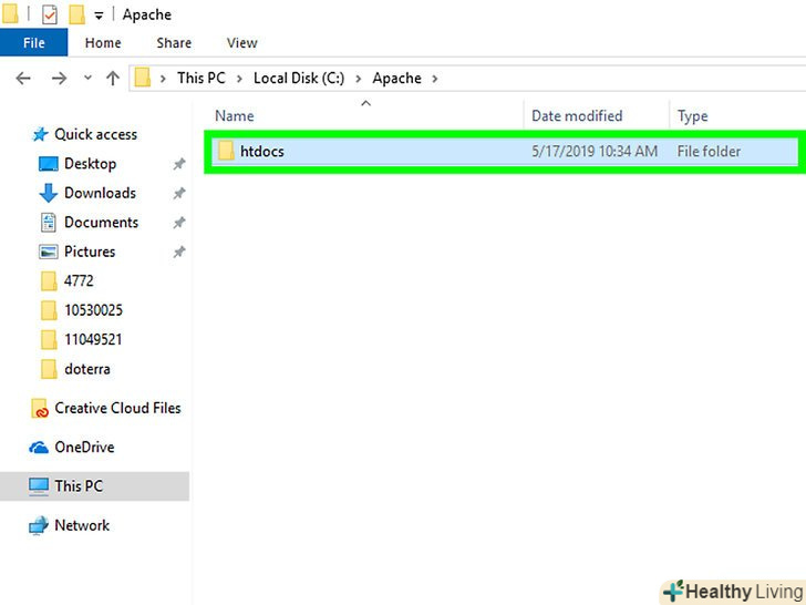 - Щоб швидко відкрити зазначену папку, клацніть по "цей комп'ютер «в лівій частині вікна, двічі клацніть по папці» Apache«, а потім двічі клацніть по папці» htdocs" (або аналогічної).