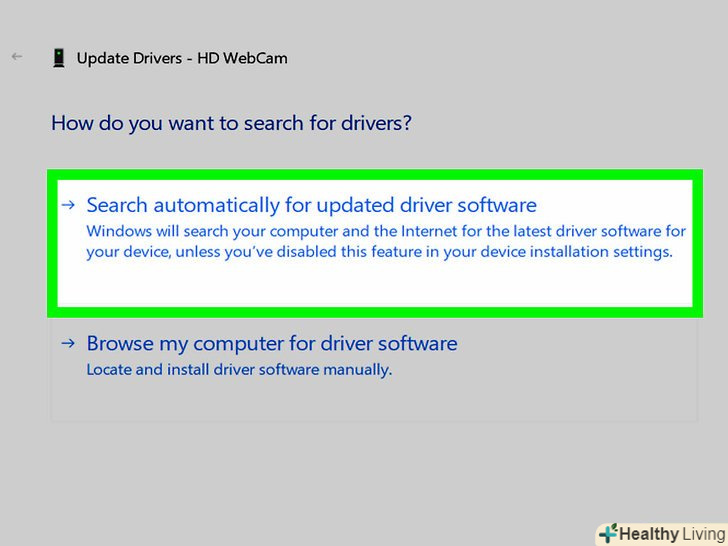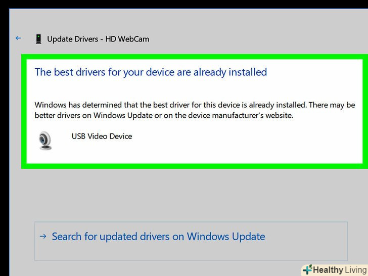 Якщо потрібно, встановіть драйвери вручну.якщо Windows не знайшла оновлені драйвери, оновіть програмне забезпечення камери вручну. Для цього:- Натисніть "Закрити" у вікні з повідомленням "останні драйвери вже встановлені";